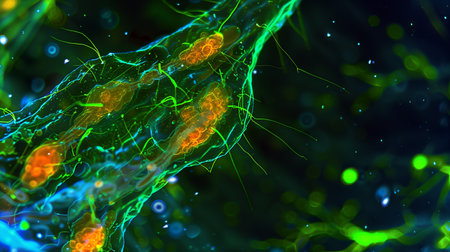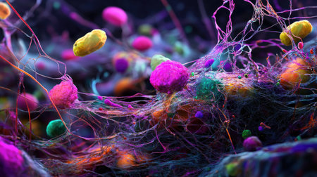 This vibrant digital illustration showcases colorful microorganisms and bacteria through an abstract lens, creating a unique visual experience ideal for science and art enthusiasts.