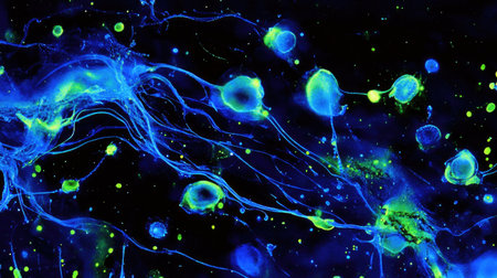 A captivating abstract image featuring bright blue and green microorganisms against a dark background, perfect for showcasing scientific themes or artistic designs.