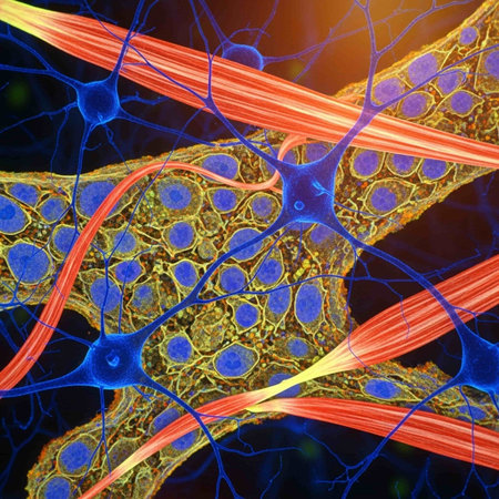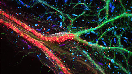 This vibrant microscopic image captures the intricate details of neurons, highlighting their colorful cellular structures. The blue nuclei and red filaments create a stunning visual representation of neural connectivity and function