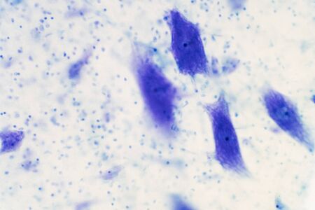 Human glioma cells. Human brainstem glioma cell culture under a microscope.