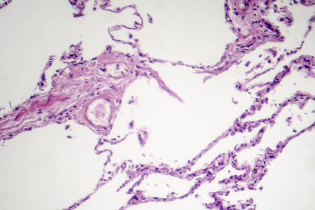 Histopathology of lung emphysema, light micrograph, photo under microscope showing enlargement of air spaces in lung tissue and destruction of alveolar septa