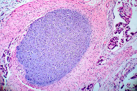 Ovarian cancer, light micrograph, photo under microscope. Photograph shows a fragment of a cancerous tumor in the female ovary. Selective focus