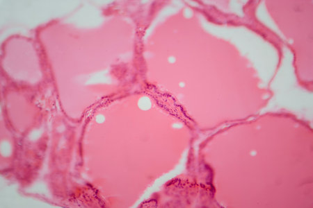 Photomicrograph of a normal thyroid gland under a microscope, exhibiting typical follicular structure and colloid-filled follicles.