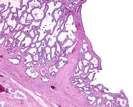 Photomicrograph showing histological features of benign prostatic hyperplasia. Enlarged prostate gland with nodular proliferation of glandular and stromal components.