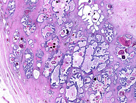 Low magnification of a human prostate gland in a 70-year-old man. The prostate gland appears with dilated alveoli, which contains many corpora amylacea (prostatic concretions) in their lumen. Light microscope micrograph. Hematoxylin & eosin stain.