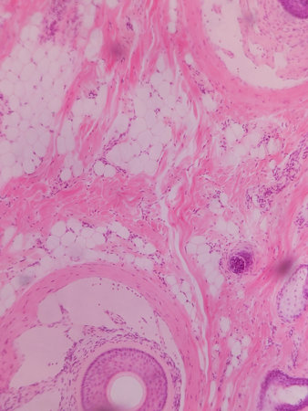 Microscopic view of tissue with pink and purple staining, showing cellular structures and connective tissue