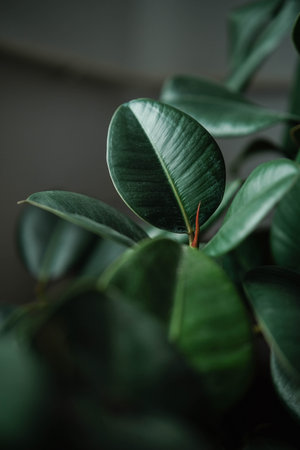 Close up of ficus elastica green leaves. Tropical conceptual background.