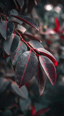 This image showcases plant leaves with deep green and red accents, presenting a rich contrast. The leaves are the primary focus, with soft lighting enhancing the textures. The blurred background suggests an outdoor setting. Suitable for various editorial and commercial applications.