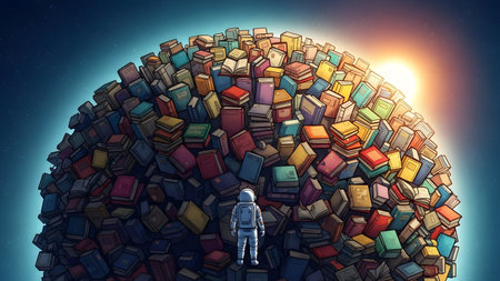 A lone astronaut looks out at a planet constructed from a multitude of colorful books in space.