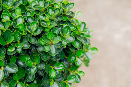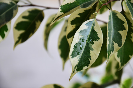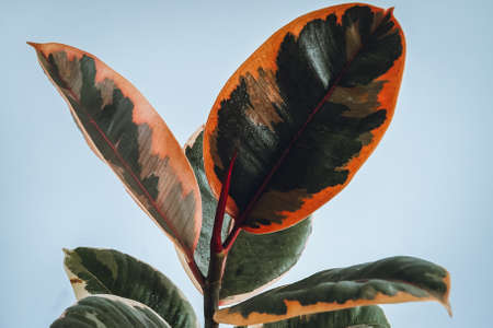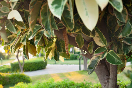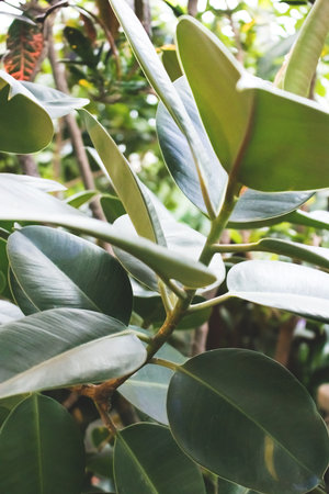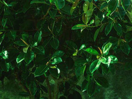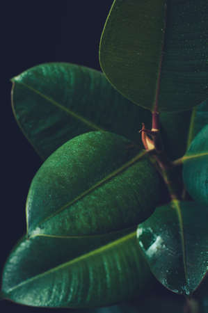 Close up of ficus elastica green leaves. Tropical conceptual background. selective focus.