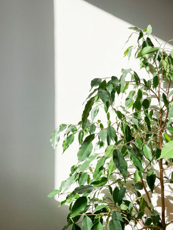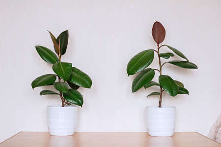 Ficus elastica (rubber fig) in the home interior. Light from the window with beautiful shadows on a wall. Home decor and gardening concept.