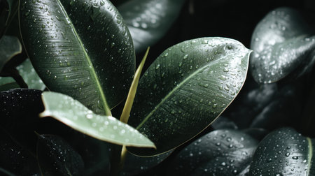 This striking close-up image showcases lush green leaves adorned with glistening raindrops, highlighting the refreshing beauty and tranquility of nature in detail.