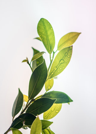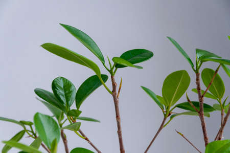 Ficus Lyrata. Beautiful fiddle leaf tree leaves on white background. Fresh new green leaves growing from fig tree, close up. Copy space. Houseplant. Plants in modern interior room