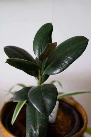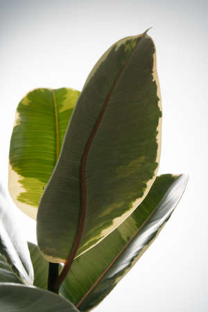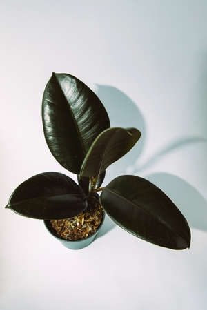 Ficus with big leaves, houseplant on white background with shadow. Flat lay