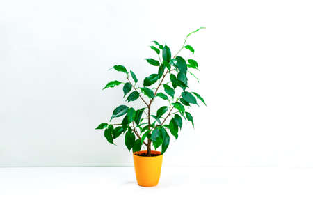 Ficus Benjamin in an orange small flowerpot on a white background. Small beautiful ficus tree with green leaves. Concept of growing and caring for houseplants.
