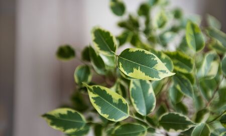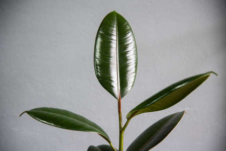 Smooth green young leaf of ficus. Ornamental plant grown in pots.