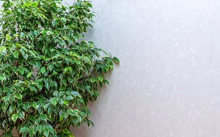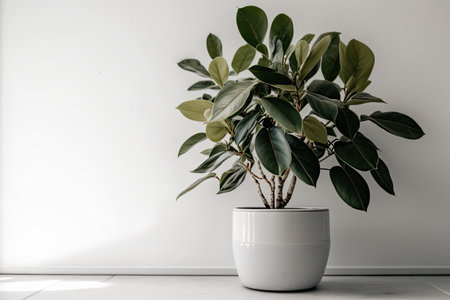 Benjamins ficus in a white pot on a white wall and blue background, lifestyle, design for a postcard, space for text, minimalism