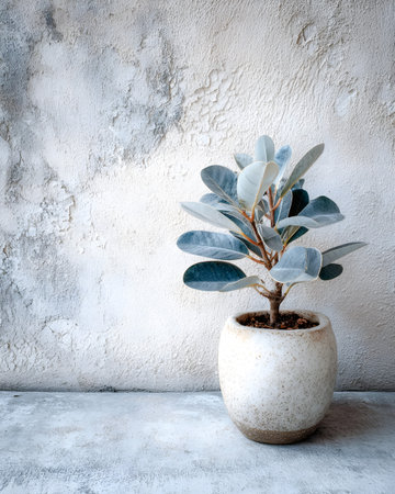 Potted plant with lush green leaves in a textured ceramic pot, positioned against a rustic wall, creating a serene and calming indoor atmosphere with natural elements