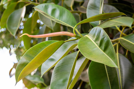 Close-up of a branch of a Ficus elastica tree with a pistil.