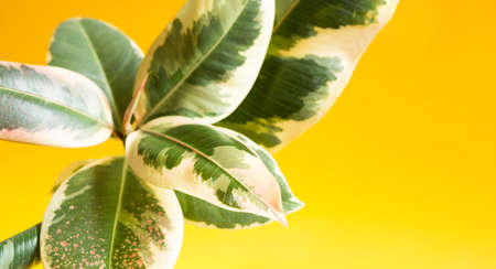 Ficus rubber variegate leaf close-up with a bud opening with a new young leaf on a yellow background. Home plant care, cultivation, watering and fertilization. Abidjan, variety elastica, Belize