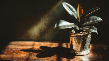 A striking indoor plant with deep green, glossy leaves sits in an antique pot, casting intricate shadows on a rustic wooden table bathed in soft, warm light.