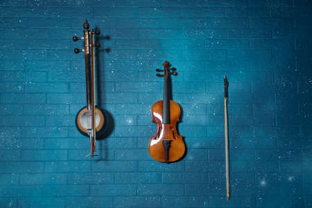 Violin and tar blue in the background.Violin in front of blue brick wall .Classical music concert poster with orange color violin on blue background with copy space for your text