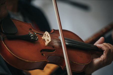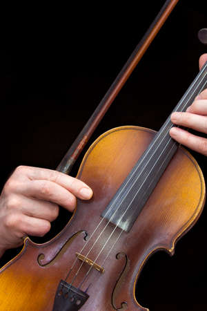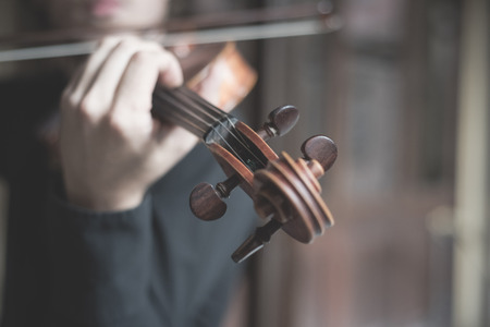 Violinists playing on a musical instrument, close-up.