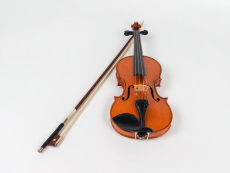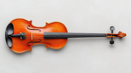 A beautifully crafted wooden violin resting on a neutral backdrop, highlighting its intricate design and artistic features, perfect for music-related themes.