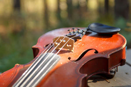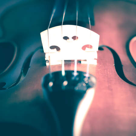 Close up view of strings of beautiful brown violin lying on wooden background. Musical instruments.