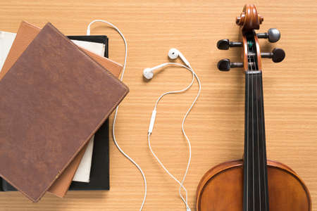 top view of stack of notebook with earphone and violin on wood background
