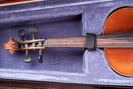Old violin in opened case. String musical instrument in velvet case. Classic musical instrument.