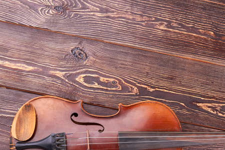 Old violin with copy space on top. Brown violin on textured wooden background, cropped image. Musical equipment in vintage style.