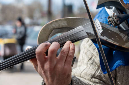 Close-up of a street musician's hands during a concert. Mature man playing electronic violin.