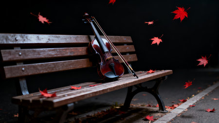 Violin and maple leaves on a bench in the park, autumn