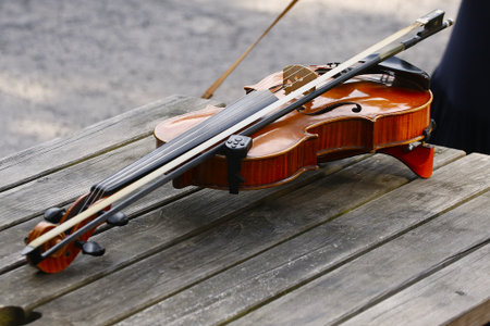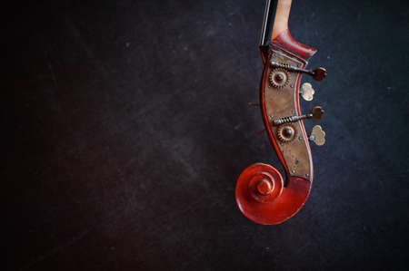 The violin on the dark table, Close - up of violin on the wooden floor, Top view of violin musical on dark wooden floor, Vintage and classic musical instrument used in the orchestra.