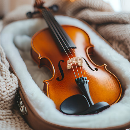 A violin rests in its case, ready to play.