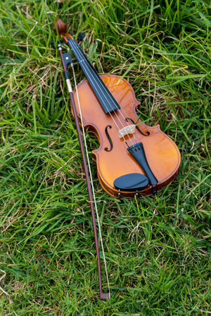 Violin and bow on green grass background. Violin and bow on green grass background.