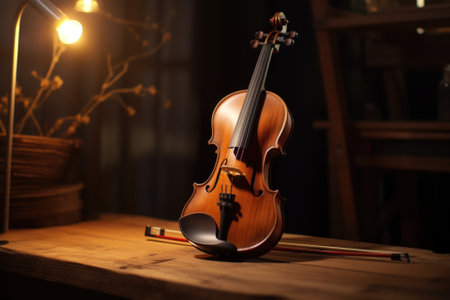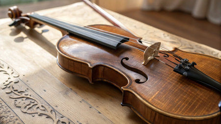 A violin resting on a wooden table, ready to be played. Perfect for music-related projects and instrument showcases.