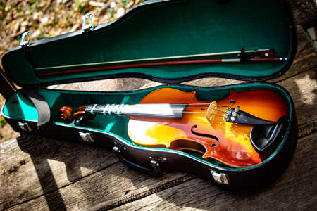 Old violin on wooden background. Purple velvet case with retro violin and copy space. Vintage musical object.