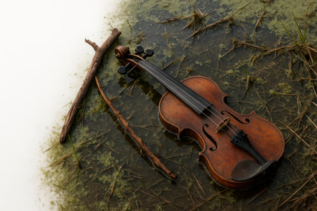 vertical postcard instrument wooden violin with bow stands in a sunny spring park among fallen golden foliage