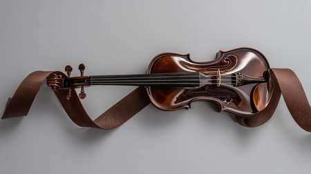 violin with brown ribbon on a gray background, top view.