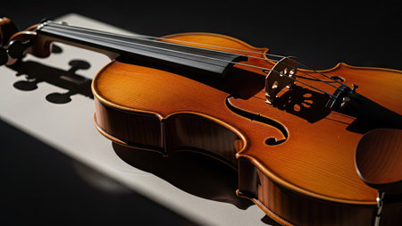 This image showcases a classical violin with its strings and details. The instrument exhibits a warm, brown hue with highlighted textures from the wood. A strong shadow casts across the surface, enhancing its shape. The composition suggests a focused, studio environment. Suitable for artistic and musical concepts.