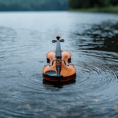 Violin floating on serene lake