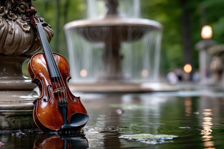 A beautifully crafted violin leans against a decorative fountain in a tranquil park, surrounded by nature.