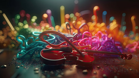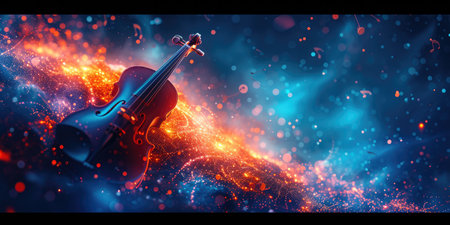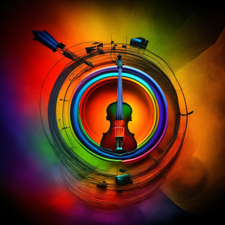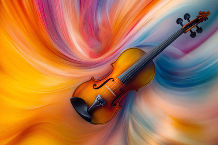 Classical string instrument floating on a colorful abstract swirl representing sound waves, music and creativity concept