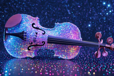 Vibrant holographic violin with iridescent colors, positioned over a light blue background, with mirrored, reflective orbs or spheres. The design features a contemporary aesthetic, and the glossy, mirroring surface of the violin and the orbs creates an engaging visual composition with a variety of geometric shapes and colorful reflections.