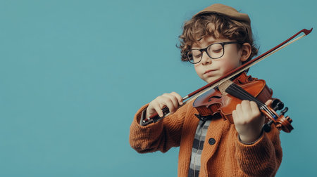 Music passion and hobby concept, violin miniature over wooden wall with retro color tone.copy space on the right for text