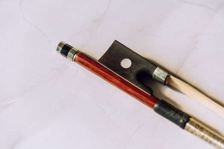 A Hero Detail shot in a square format, isolating the scroll and the bow tip of a fiddle. Emphasis on