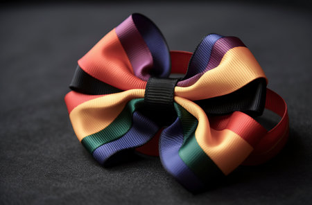 colorful ribbon bow with multiple hues against a dark, textured background, creating a vibrant, rainbow-like effect