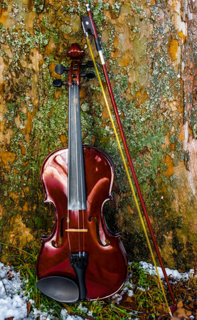 Violin and bow on green grass background. Violin and bow on green grass background.